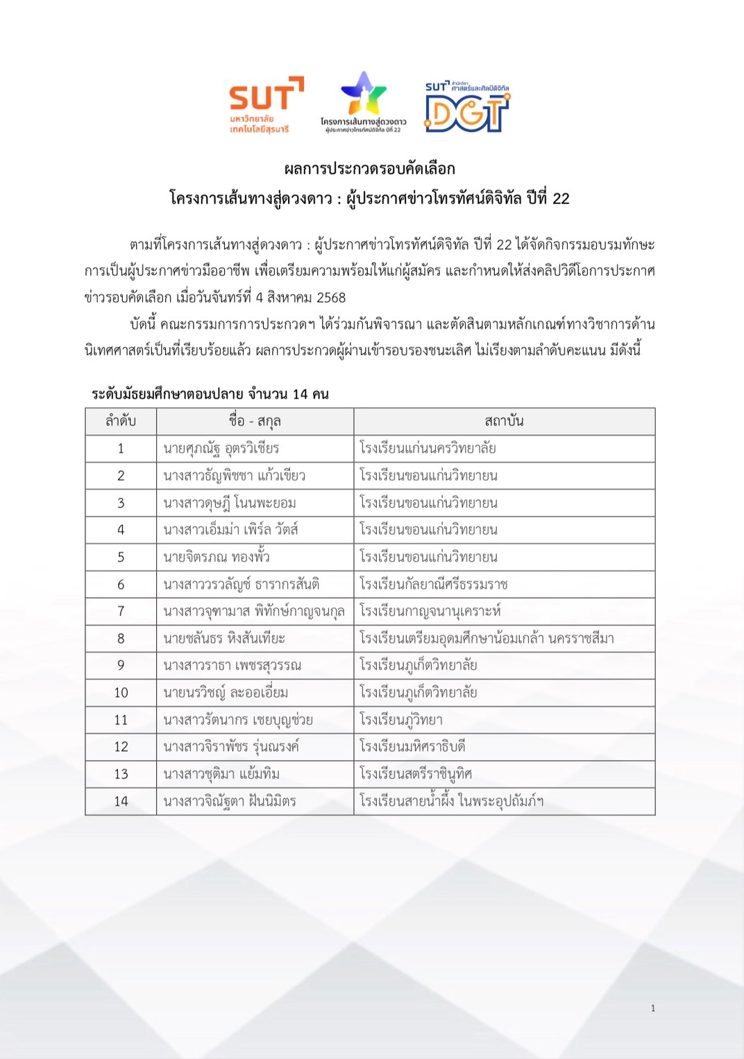ผลการประกวดผู้ประกาศข่าวโทรทัศน์ดิจิทัล ปีที่ 22 รอบคัดเลือก “โครงการเส้นทางสู่ดวงดาว ”