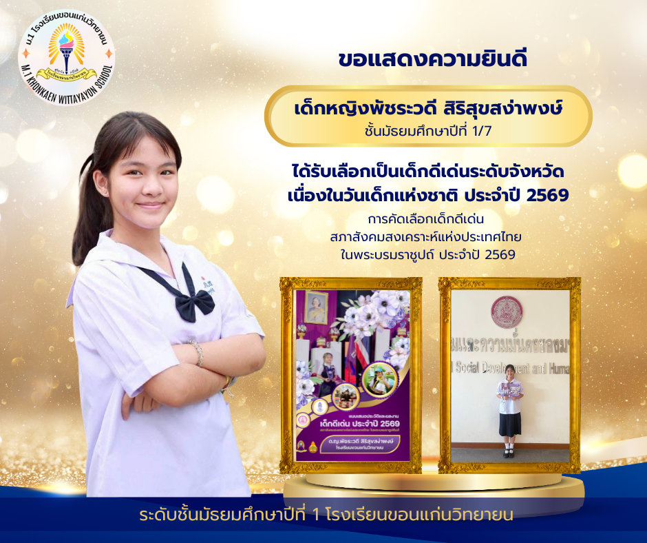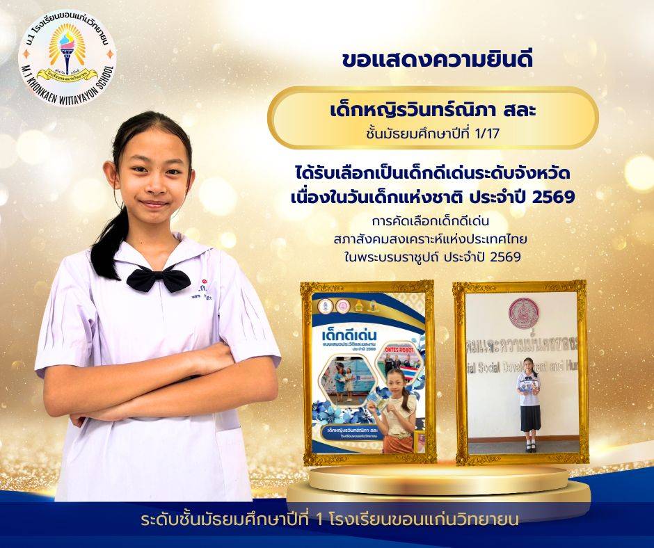 ผลการพิจารณานักเรียนได้รับการคัดเลือกเป็นเด็กดีเด่นระดับจังหวัด เนื่องในวันเด็กแห่งชาติ ประจำปี 2569 จำนวน 2 คน ได้แก่