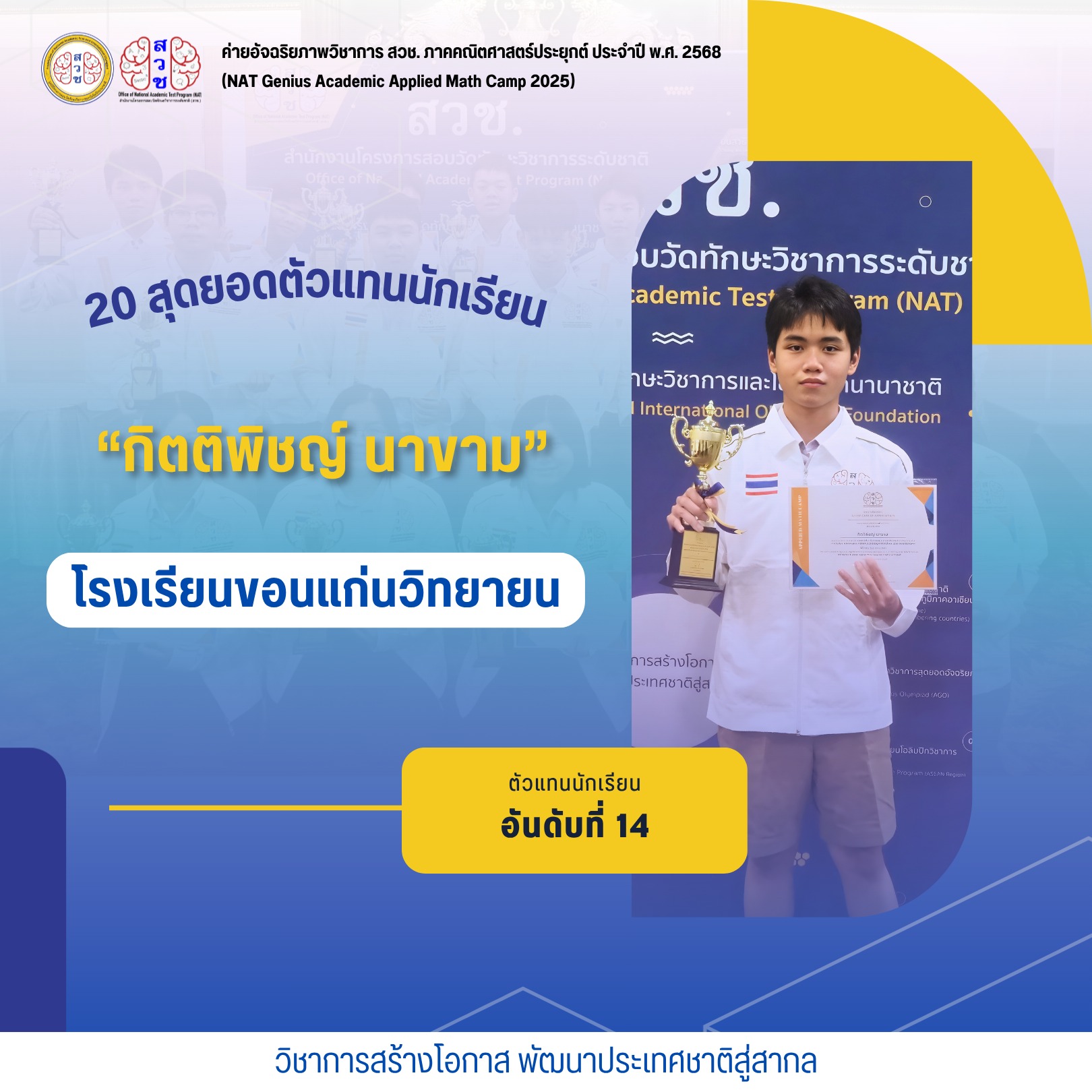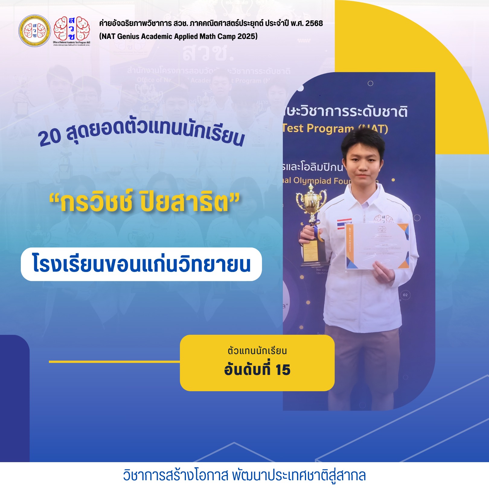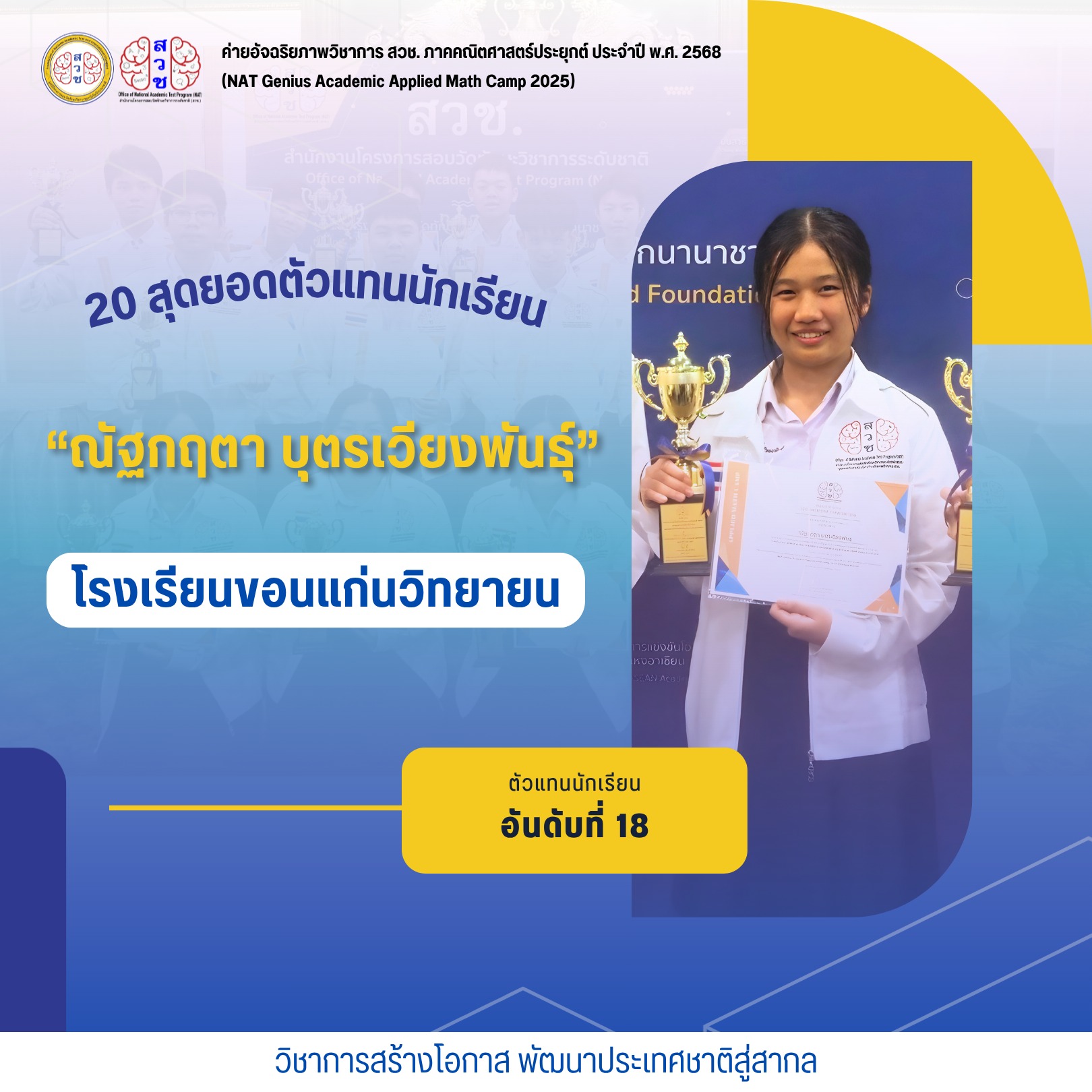 ได้รับการคัดเลือกเป็นตัวแทนนักเรียนอัจฉริยภาพวิชาการ สวช. ด้านคณิตศาสตร์ประยุกต์ประจำปี 2568 (NAT Genius Academic Applied Math Camp 2025)