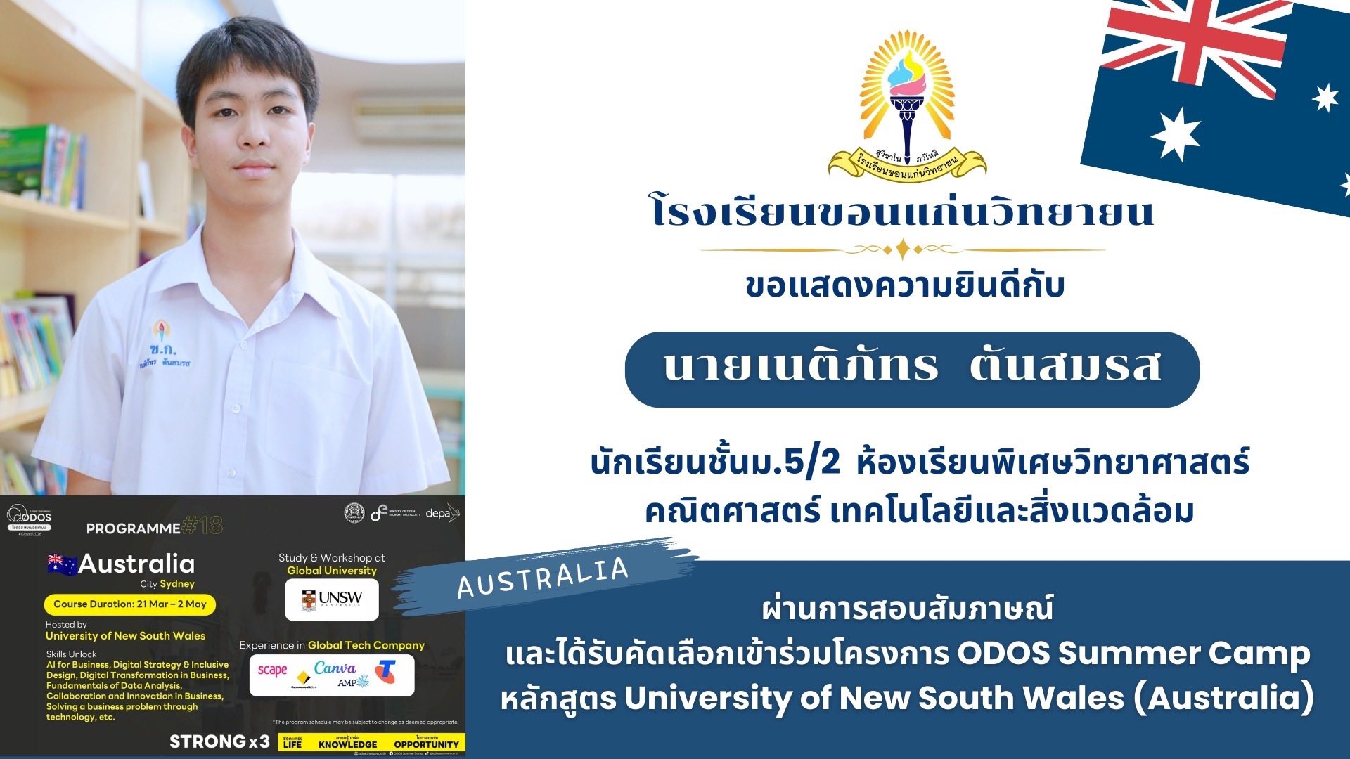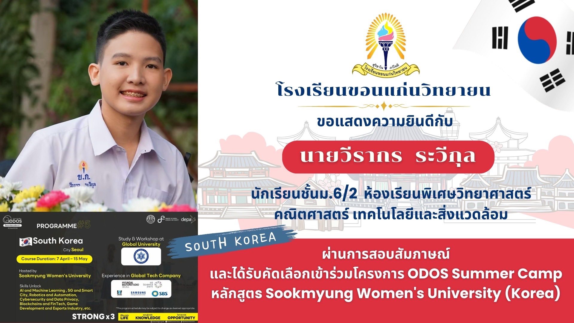 โรงเรียนขอนแก่นวิทยายนขอแสดงความยินดีกับนักเรียนที่ผ่านการสอบสัมภาษณ์และได้รับการคัดเลือกเข้าร่วมโครงการ ODOS Summer Camp