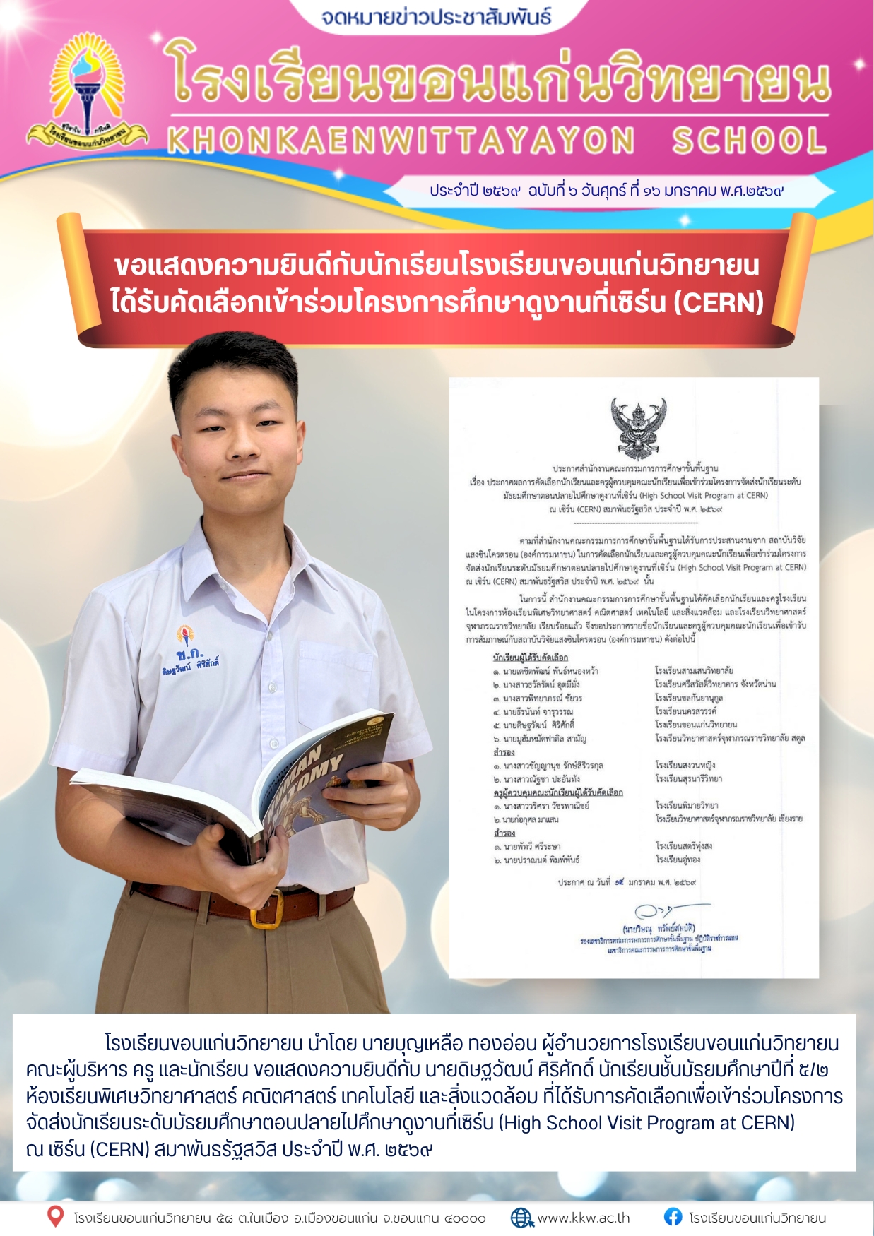 โรงเรียนขอนแก่นวิทยายนขอแสดงความยินดีกับนักเรียนที่ได้รับการคัดเลือกเพื่อเข้าร่วมโครงการจัดส่งนักเรียนระดับมัธยมศึกษาตอนปลายไปศึกษาดูงานที่เซิร์น (High School Visit Program at CERN)